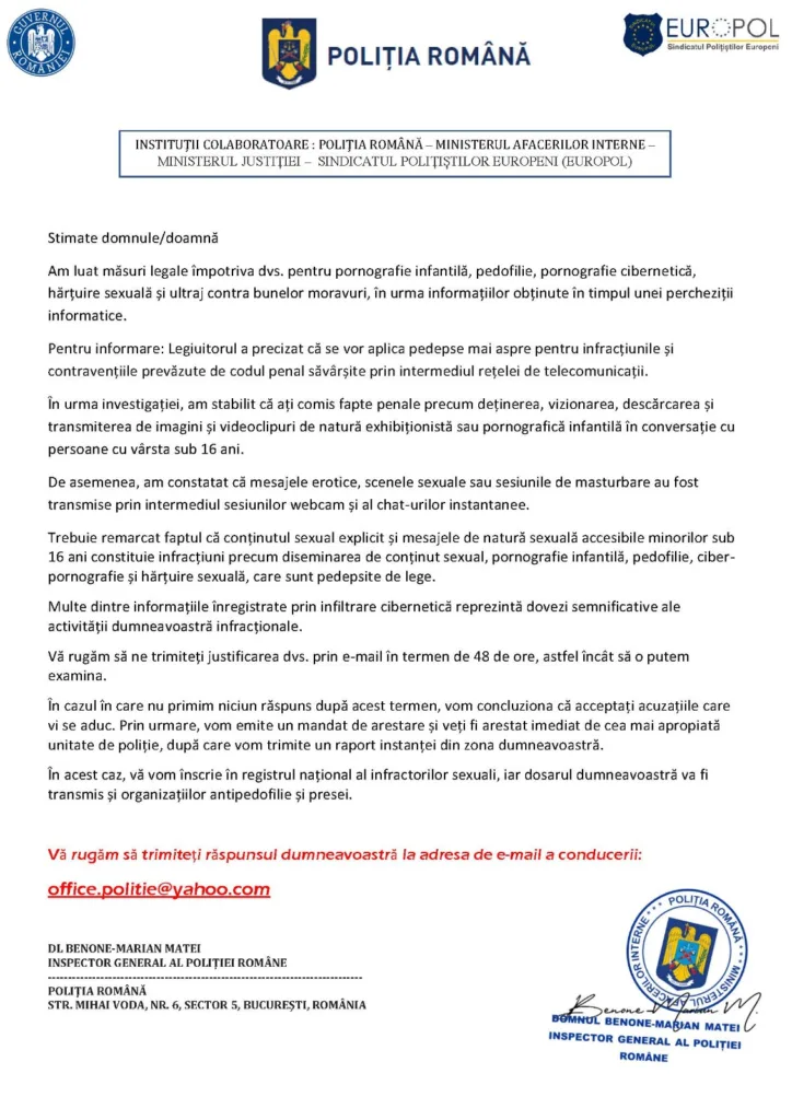 Mesajul este făcut să pară legitim, dacă nu te uiti cu atenție. Are antetul Poliției Române, așa-zisa semnătură a inspectorului general al IGPR, iar adresa indicată de răspuns este office.politie@yahoo.com.